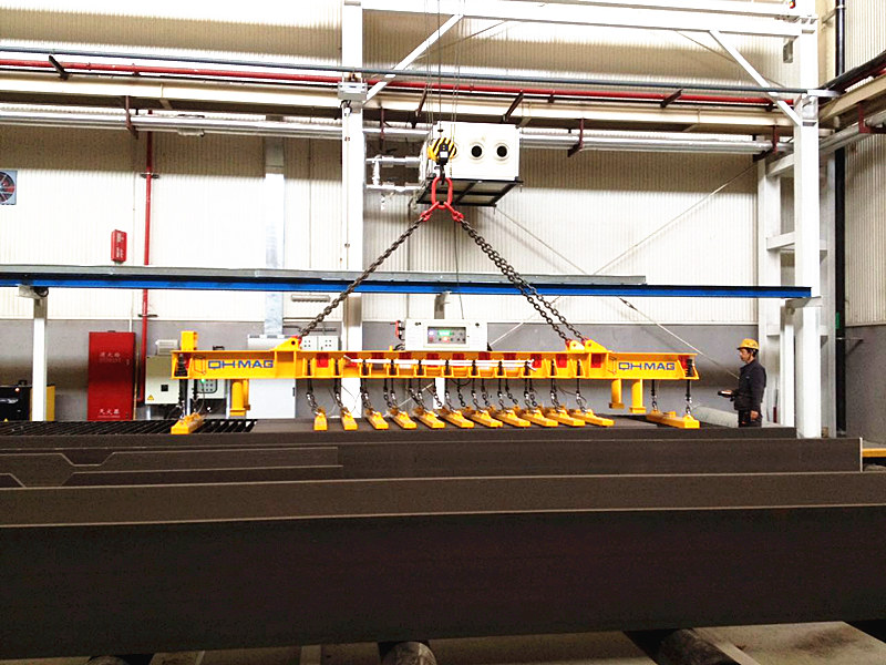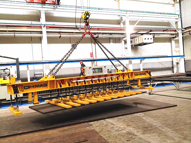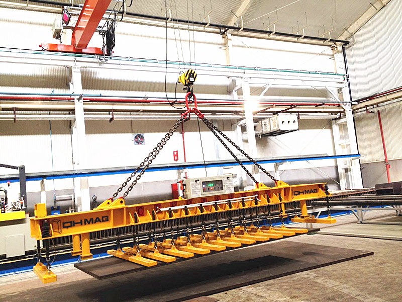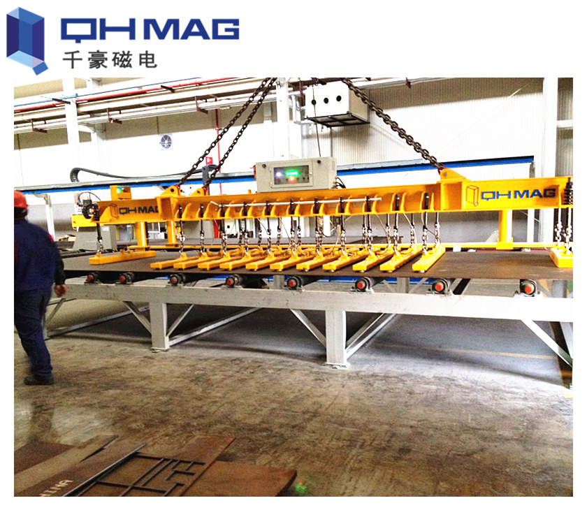 湖南千豪鋼板上下料切割線用電永磁吊具屬于鋼板吊具的一種:鋼板切割線(火焰切割、等離子切割、激光切割等)的上下料,通常要求上料時只吊運(yùn)一張整板,切割完后,所有切割工件一次性或盡量多的從切割臺上吊運(yùn)下來,針對這一要求,千豪磁電研發(fā)了矩陣式和密布式電永磁吊具系統(tǒng)。