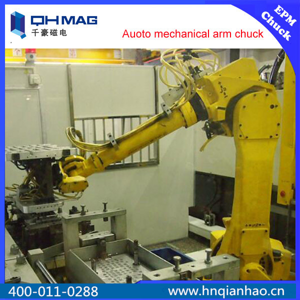 在夾持上之前都是用機(jī)械夾具來(lái)搬運(yùn)夾持工件,速度非常慢,生產(chǎn)效率很低,還需要配合各種擺動(dòng),移動(dòng),復(fù)合運(yùn)動(dòng)來(lái)實(shí)現(xiàn)搬運(yùn)工件到指定的位置,也會(huì)造成工件的損壞和變形。為了解決這一問(wèn)題,千豪磁電研發(fā)生產(chǎn)的電永磁工裝夾具,外形小巧,超強(qiáng)磁力吸附住工件,不會(huì)損壞工件,安裝到機(jī)械手上接入控制系統(tǒng)操作。使生產(chǎn)效率提高2倍!