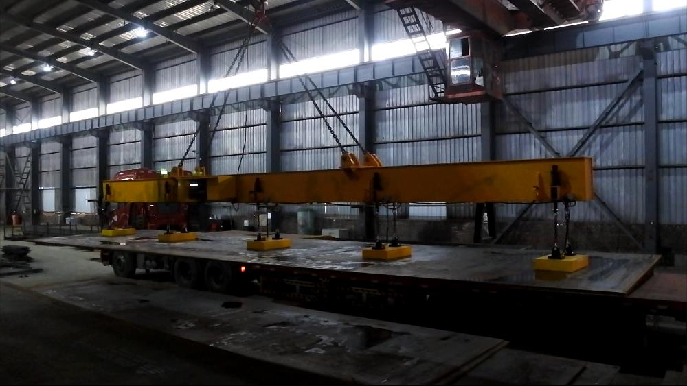 電永磁鐵聯(lián)用。對(duì)于中厚板(6mm~32mm)電磁鐵的間距多取3~4米,兩端外伸部分的長(zhǎng)度可取間距的二分之一。根據(jù)吊運(yùn)張數(shù)的不同,又分為350型與400型兩類。350型適合于中厚板廠、造船廠、機(jī)械制造廠,采用調(diào)磁控制方式,能起吊一張或一定張數(shù)鋼板。400型適用一次搬運(yùn)盡量多的張數(shù),可根據(jù)用戶要求另行設(shè)計(jì)制造吊運(yùn)700℃以下鋼板用高溫型產(chǎn)品。